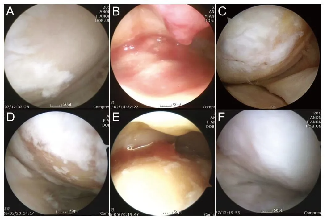 A/D為治療前,白色示意軟骨,淺黃色示意裸露的骨。B/E為間充質干細胞注射。C/F為治療后的關節鏡檢查。