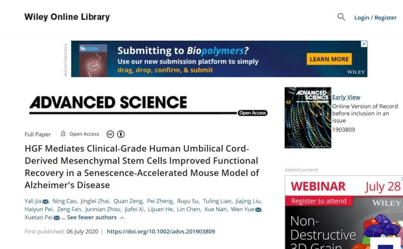 2020年7月6日,國際學(xué)術(shù)期刊《Advanced Science》在線發(fā)表了軍事科學(xué)院軍事醫(yī)學(xué)研究所和華南干細(xì)胞與再生醫(yī)學(xué)研究中心的最新研究成果“HGF介導(dǎo)臨床級(jí)人臍帶間充質(zhì)干細(xì)胞改善功能恢復(fù)在衰老加速的阿爾茨海默氏病小鼠模型中”。