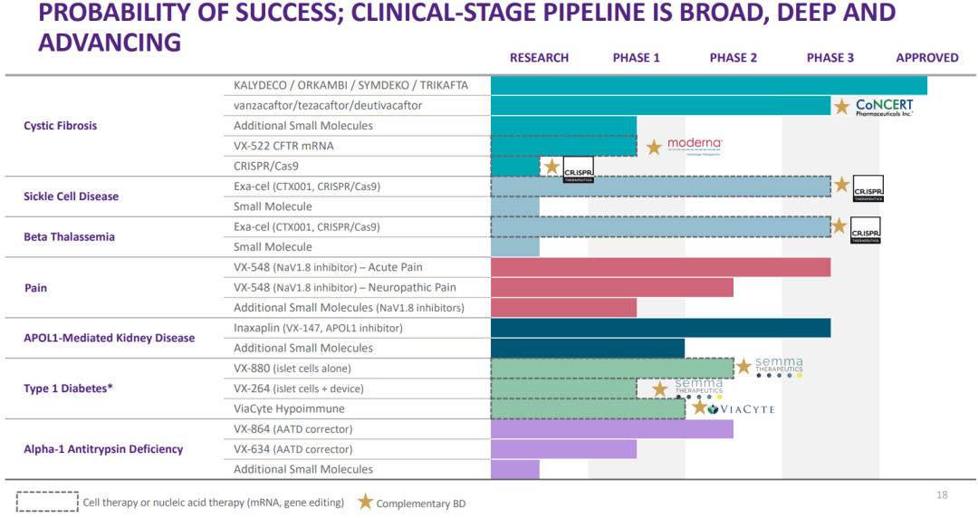 目前,Vertex除了1型糖尿病等自身免疫疾病產(chǎn)品外,其適應(yīng)癥覆蓋甚廣,在杜氏肌營養(yǎng)不良癥(DMD)、肺囊性纖維化(CF)以及肺部和肝臟疾病等領(lǐng)域均有布局。而Vertex與CRISPR合作的全球首款CRISPR基因編輯療法exa-cel已經(jīng)上市在即,Vertex近期引起了不少關(guān)注,其最近動(dòng)態(tài)也不可謂不頻繁。在3月1日,Vertex還與ImmunoGen達(dá)成了一項(xiàng)全球多目標(biāo)許可和期權(quán)協(xié)議,ImmunoGen授予Vertex使用其ADC技術(shù)進(jìn)行研究的權(quán)利,以發(fā)現(xiàn)用于基因編輯的新型靶向調(diào)節(jié)劑。結(jié)合近期的動(dòng)態(tài)來看,Vertex在完善CRISPR基因療法領(lǐng)域的布局的同時(shí),似乎也在嘗試進(jìn)軍其他領(lǐng)域,管線廣泛覆蓋了基因療法、mRNA、tRNA甚至是ADC藥物。