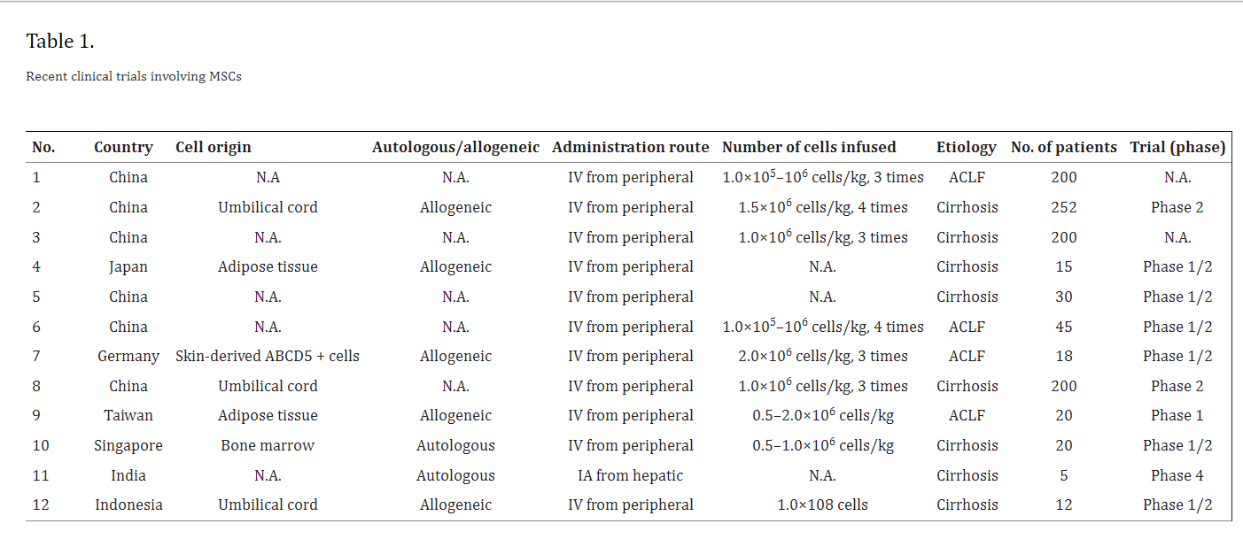 此外,為了描述以MSC為導向的臨床試驗的最新趨勢,我們根據ClinicalTrials.gov(表格1). 其中大部分在亞洲國家注冊。研究在細胞來源、自體與同種異體性質以及肝硬化的病因學方面各不相同。然而,在大多數研究(12項中的11項)中,MSC給藥是通過外周注射每劑約1×106MSC/kg。研究不僅關注肝硬化,還關注急性慢性肝衰竭 (ACLF)。由于MSCs在炎癥期間表現出更強的治療效果,因此它們在ACLF的情況下可能特別有效??偠灾?,許多面向MSC的臨床試驗尚未超過I期或II期。