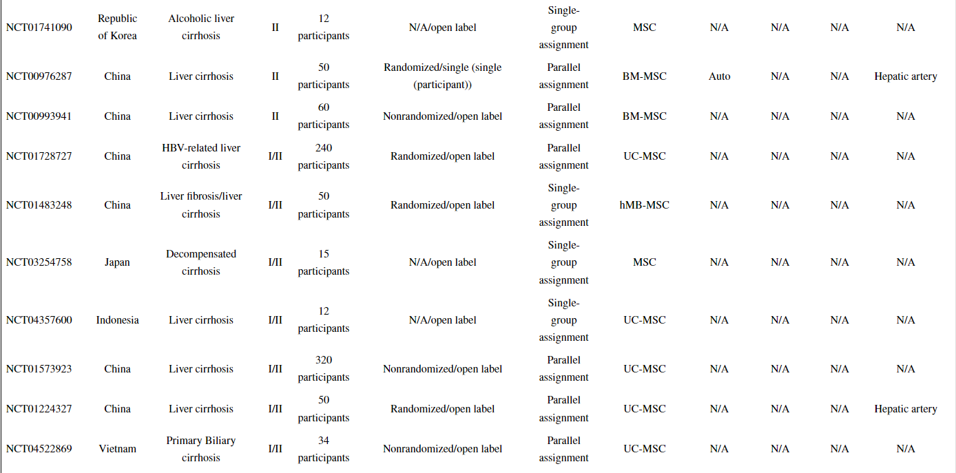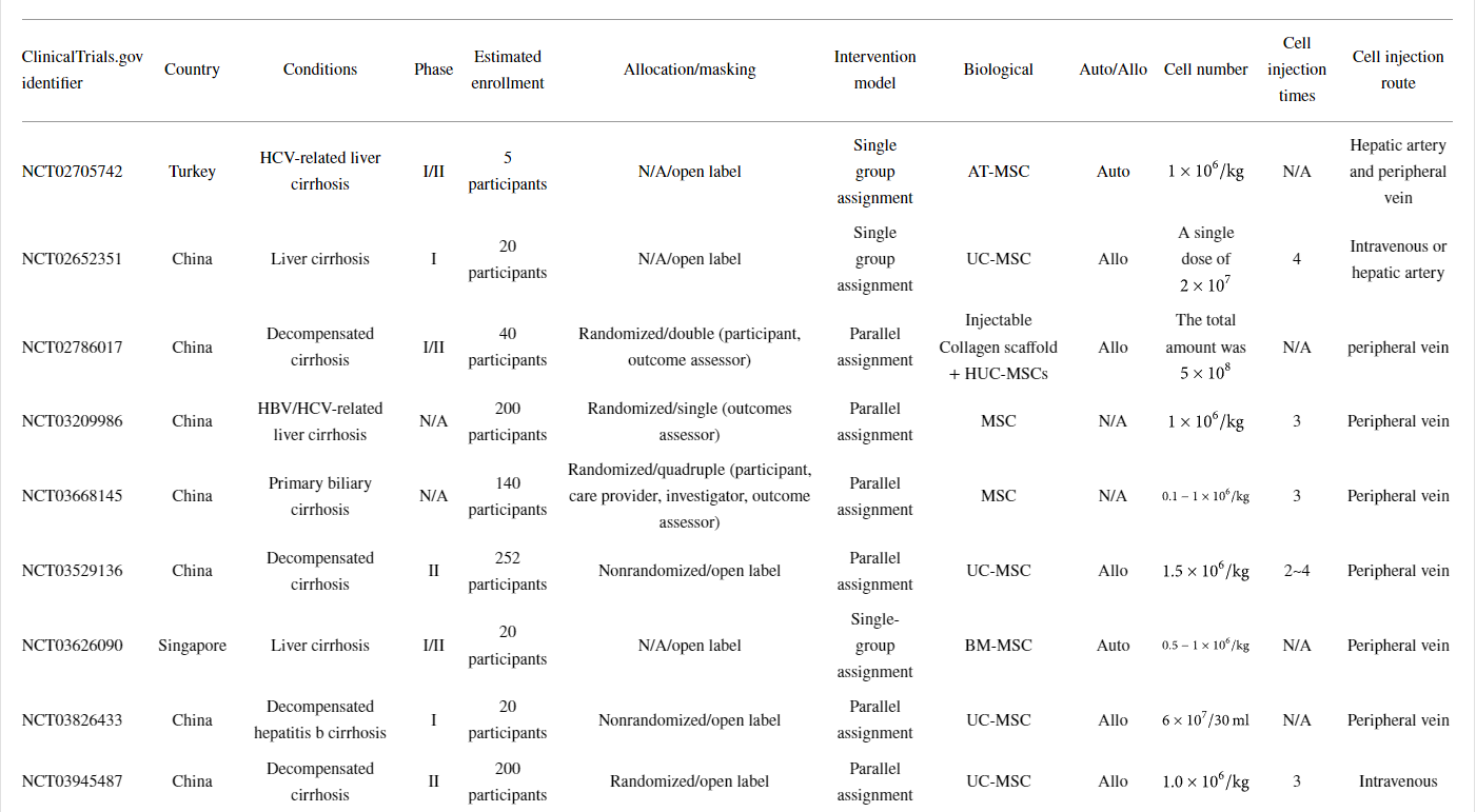 以上顯示了31項已完成或正在進行的MSC治療或MSC聯合細胞治療肝硬化(LC)的臨床試驗。同時,已經發(fā)表了許多描述使用MSCs進行臨床試驗結果的報告。