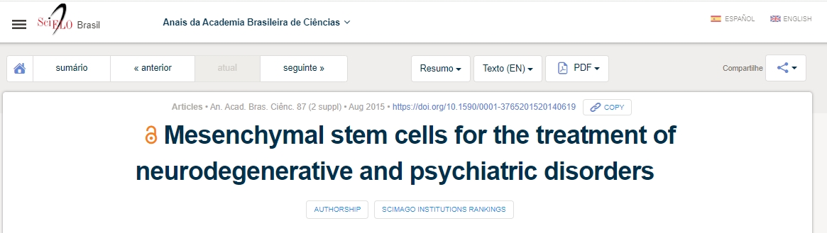 2015年,《Anais da Academia Brasileira de Ciências》巴西科學院年鑒雜志發表了“間充質干細胞用于治療神經退行性疾病和精神疾病”的文獻綜述,在精神疾病內容為:
