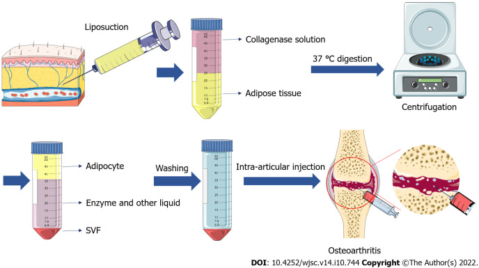 大多數研究使用來自腹部、臀部和大腿外側的脂肪組織,體積(對于一個膝蓋)在60到215毫升之間;SVF細胞的數量從2×106到3×107; 用于關節內注射的SVF制劑的最終體積從2.5到5mL不等。雖然OA的程度、脂肪組織的體積、SVF細胞的數量和活力很難保持一個統一的標準,但現有的研究已經證明了積極的治療效果,VAS、WOMAC、ROM、MRI、KOOS、Lysholm等評分改善,患者疼痛減輕,炎癥癥狀減輕。同時,關節功能也得到一定程度的改善。圖1描述了在當前臨床環境中使用SVF治療OA的一般步驟。