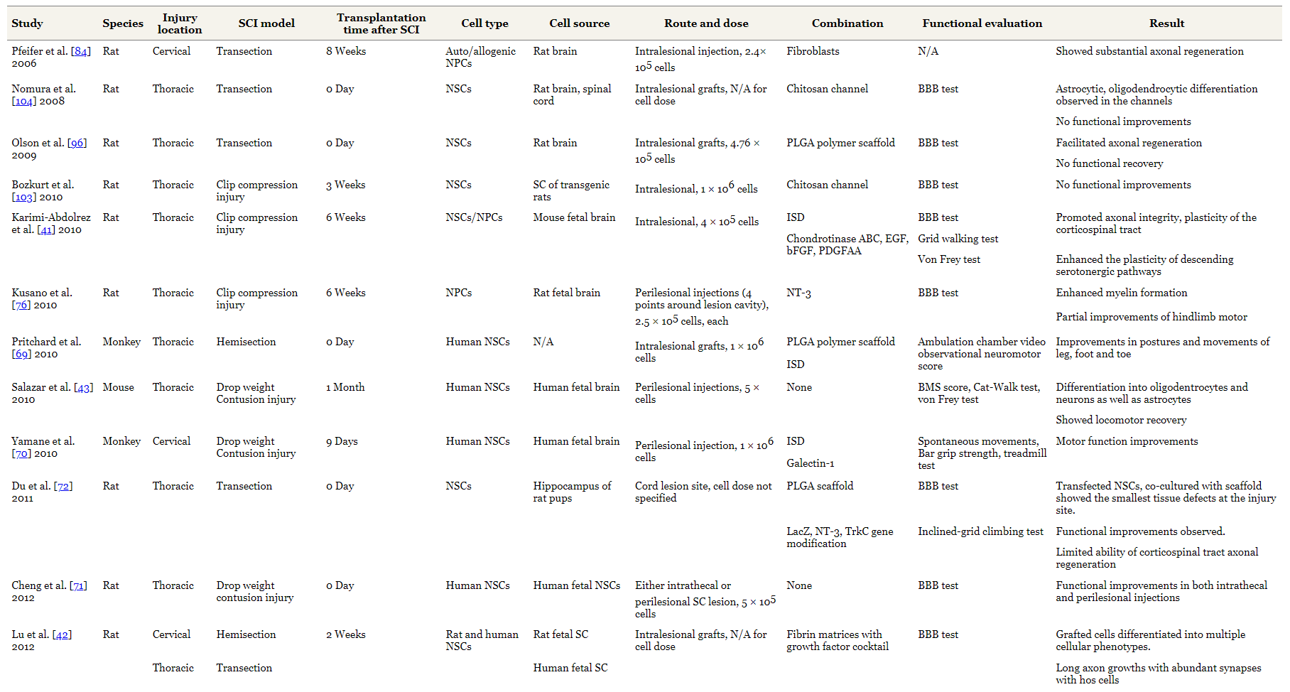 | 戈布里爾等人2017年 | 美國 | 第二階段 | 頸/胸 | SCI后至少4個月 | NSC (HuCNS-SC) | 人類胎兒大腦 | 病灶內注射 | 整體平均功能結果測量的改進 |