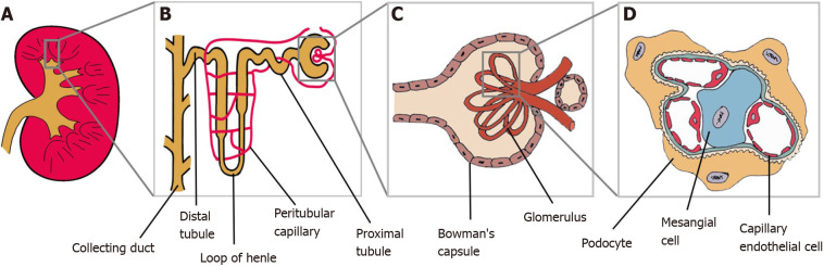 B:腎單位的放大倍數(shù);C:腎小體;D:腎小球。足細(xì)胞、系膜細(xì)胞和毛細(xì)血管內(nèi)皮細(xì)胞是腎小球結(jié)構(gòu)的一部分。