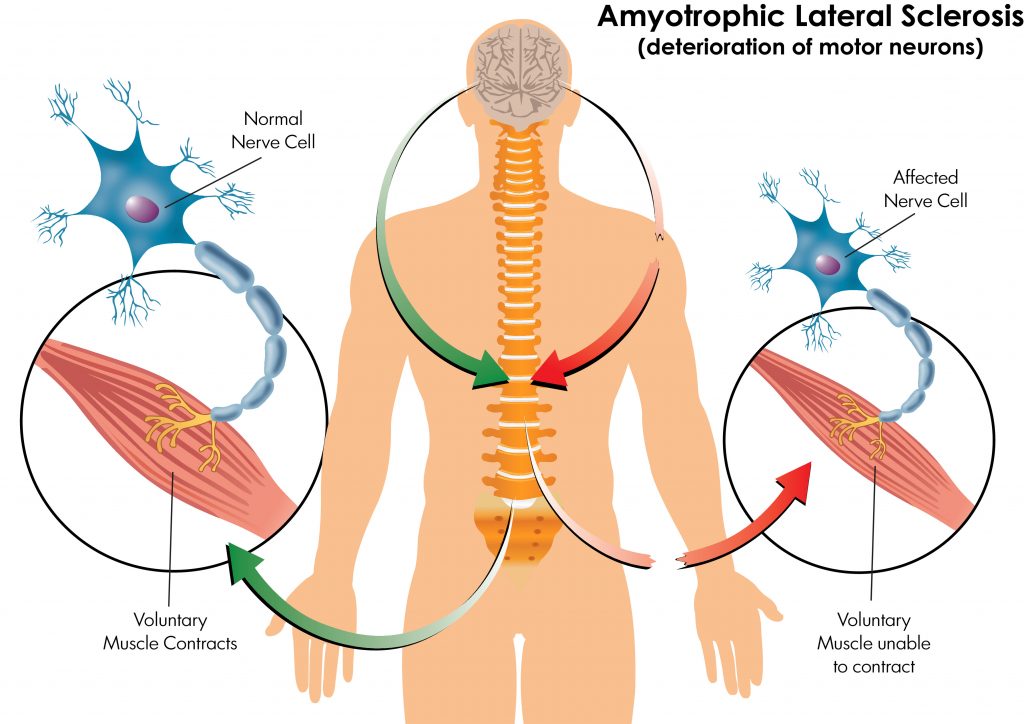 在 ALS 中,運動神經元退化然后死亡。這些神經元不再能夠控制肌肉功能,患者會出現一系列虛弱的運動癥狀。