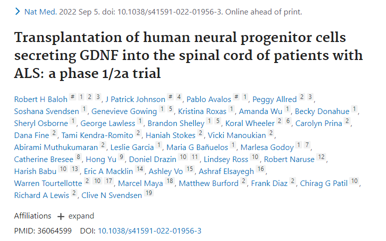 總結:研究表明用GDNF轉導的人神經祖細胞(CNS10-NPC-GDNF)分化為星形膠質細胞可以保護脊髓運動神經元,在動物模型中是安全且有效的。