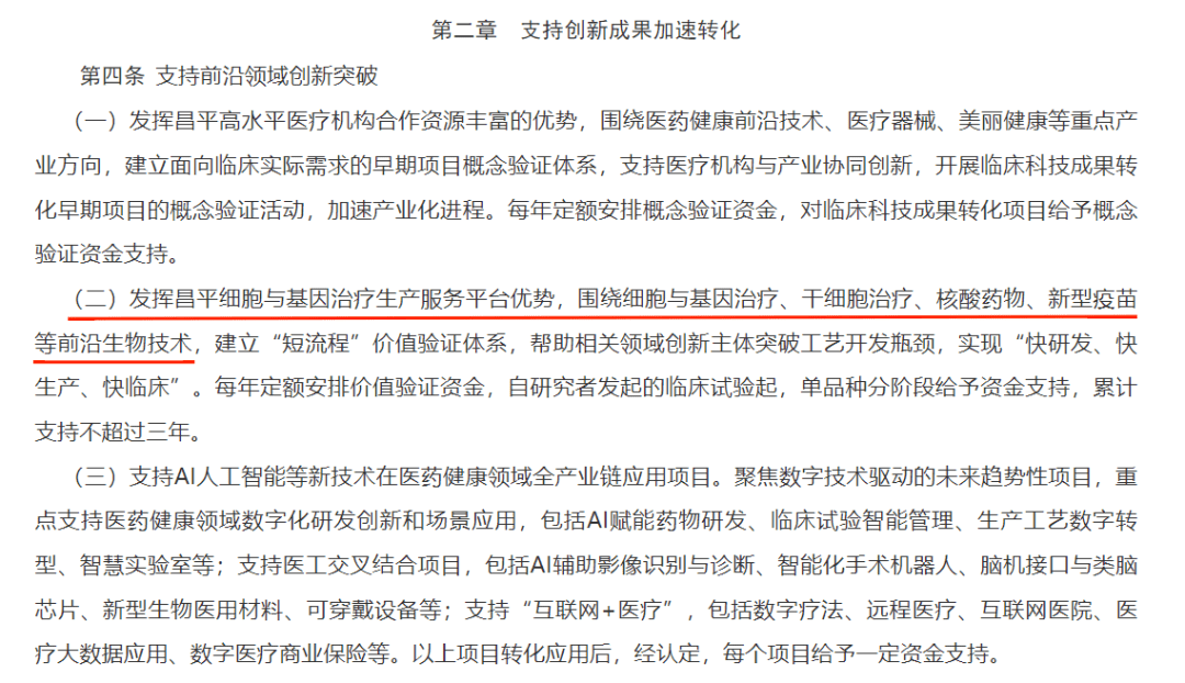8月1日,北京市昌平區(qū)人民政府印發(fā)《中國(北京)自貿(mào)試驗區(qū)科技創(chuàng)新片區(qū)昌平組團促進醫(yī)藥健康產(chǎn)業(yè)發(fā)展支持辦法》,重點支持包括細胞與基因治療(CGT)在內(nèi)的四大方向,實現(xiàn)細胞與基因治療、干細胞治療等前沿生物技術(shù)及相關(guān)領(lǐng)域的創(chuàng)新突破。(來源:昌平區(qū)人民政府官網(wǎng))