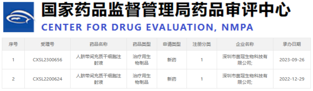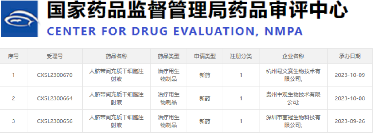 最近,國(guó)家藥品監(jiān)督管理局藥品審評(píng)中心又公示了三家公司的干細(xì)胞新藥申請(qǐng),這三家公司分別是深圳市茵冠生物科技有限公司(CXSL2300656)、貴州中觀生物技術(shù)有限公司(CXSL2300664)和杭州易文賽生物技術(shù)有限公司(CXSL2300670)。值得一提的是,這次受理新藥名稱(chēng)均為“人臍帶間充質(zhì)干細(xì)胞注射液”。