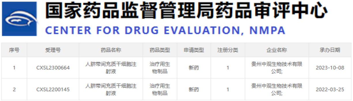 2023年10月8日,貴州中觀生物技術(shù)有限公司獲得了受理批號(hào)CXSL2300664,這是該公司的第二款細(xì)胞藥物IND獲受理。早在2022年3月25日,他們的首款“人臍帶間充質(zhì)干細(xì)胞注射液”獲得了CDE默示許可,適應(yīng)癥為膝骨關(guān)節(jié)炎的治療。