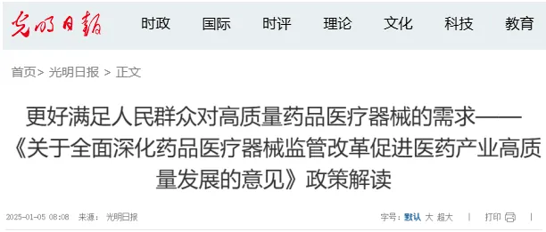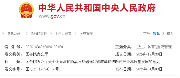 2025年1月3日,國務(wù)院辦公廳發(fā)布了《關(guān)于全面深化藥品醫(yī)療器械監(jiān)管改革促進醫(yī)藥產(chǎn)業(yè)高質(zhì)量發(fā)展的意見》(國辦發(fā)〔2024〕53號)。國家藥監(jiān)局相關(guān)負責(zé)人表示,意見的出臺將深化藥品醫(yī)療器械監(jiān)管全過程改革,加快構(gòu)建全國統(tǒng)一大市場,打造全球競爭力的創(chuàng)新生態(tài),助力我國從制藥大國向制藥強國跨越。