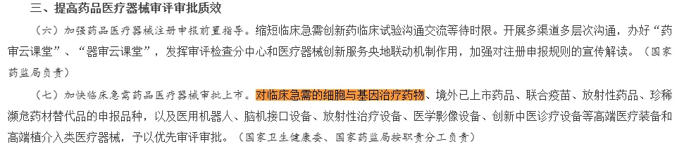 1. 審評審批提速:創(chuàng)新成果更快惠及患者《意見》明確指出,對臨床急需的基因與細胞治療藥物實行優(yōu)先審評審批,并大幅縮短審批時間。例如,臨床試驗審批時間從60個工作日縮短至30個工作日。這一舉措打通了從實驗室到市場的“最后一公里”,讓科研成果得以及時轉(zhuǎn)化,更快服務(wù)于患者。