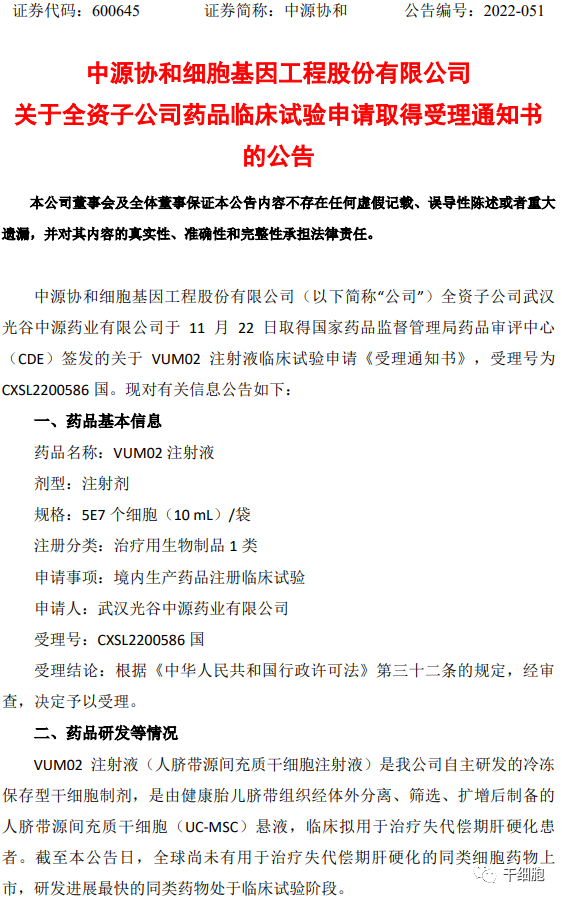 中源協(xié)和細胞基因工程股份有限公司(以下簡稱“公司”)全資子公司武漢光谷中源藥業(yè)有限公司于11月22日取得國家藥品監(jiān)督管理局藥品審評中心(CDE)簽發(fā)的關(guān)于VUM02注射液臨床試驗申請《受理通知書》,受理號為CXSL2200586 國。現(xiàn)對有關(guān)信息公告如下: