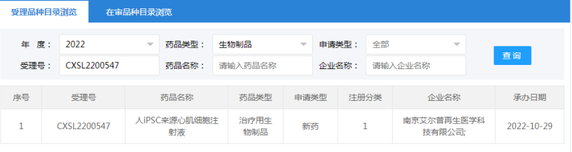 2022年10月29日,南京艾爾普再生醫學科技有限公司“人iPSC來源心肌細胞注射液”的藥物臨床試驗申請獲受理(受理號:CXSL2200547)。這是繼2021年12月17日南京艾爾普“人iPSC來源心肌細胞注射液”之后的第二次申報獲得受理,此前該干細胞藥物(受理號:CXSL2101489)申報已暫停,此次申報受理可以視為是該干細胞藥物完善材料后的第二次申報。