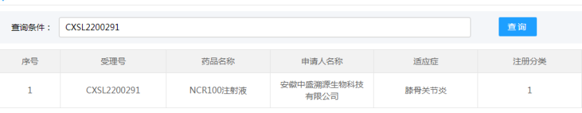 安徽中盛溯源生物科技有限公司的“NCR100注射液誘導多能干細胞來源的間充質干細胞)的藥物臨床試驗申請獲得默示許可(受理號:CXSL2200291),適應證為:膝骨關節炎