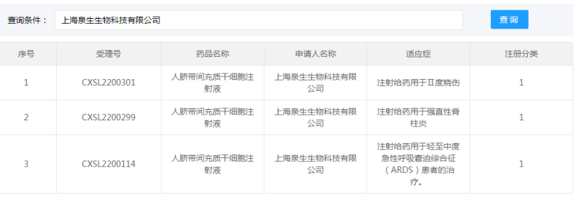 上海泉生生物科技有限公司的“人臍帶間充質干細胞注射液”的藥物臨床試驗申請獲得默示許可(受理號:CXSL2200299與CXSL2200301),適應證為:強直性脊柱炎和Ⅱ度燒傷。