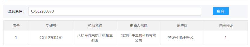 北京貝來生物科技有限公司的“人臍帶間充質干細胞注射液”的藥物臨床試驗申請獲得默示許可(受理號:CXSL2200370),適應證為:特發性肺纖維化