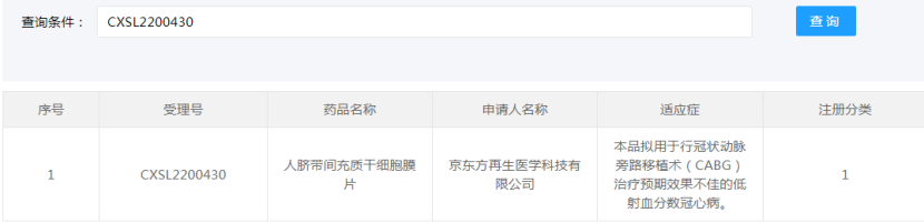 2022年11月22日,藥品監督管理局藥品審評中心官網顯示,京東方再生醫學科技有限公司自主研發的“人臍帶間充質干細胞膜片”(受理號:CXSL2200430)獲得新藥臨床試驗默示許可,適應證為:用于行冠狀動脈旁路移植術(CABG)治療預期效果不佳的低射血分數冠心病。