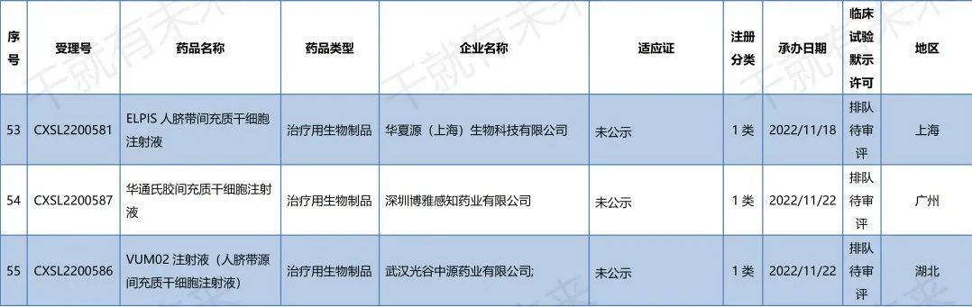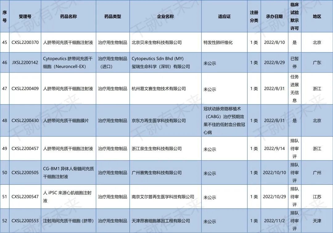 中國干細胞藥物注冊申報進展(2022年9月1日-11月30日)