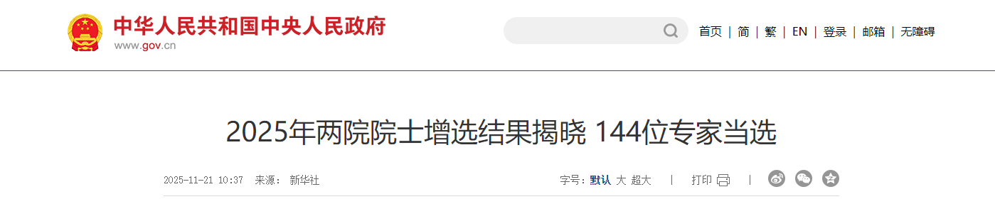 2025年11月21日,中國科學院與中國工程院正式公布了新一屆院士增選結果,共144位杰出專家當選。其中,中國科學院新增院士73位,中國工程院新增院士71位。